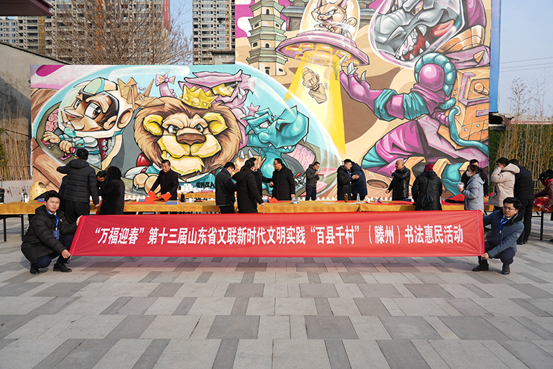 1月21日上午,由滕州市宣传部、文明办、新时代文明实践服务中心主办的“翰墨贺岁·福满善城·万福迎春”新春送祝福活动在山东兴滕置业开发的兴滕·未来城、柳岸风和两项目的营销中心现场举行,滕州市文联、文旅局、文化馆、书法协会书画家二十余人参加了本次活动,用传统的书画艺术形式,为市民群众送上饱含真心的新